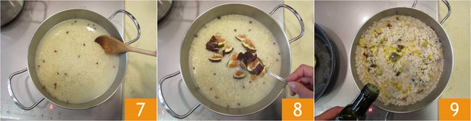 After 5 minutes 7 pour the figs 8 and mix. Bring the rice to cook by adding broth as needed. Turn off the heat and stir in a drizzle of olive oil 9.