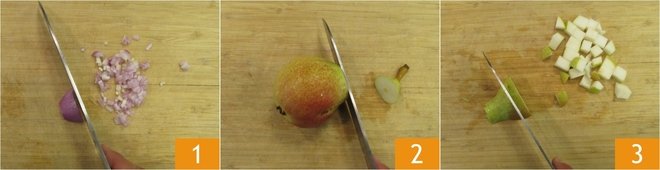 To prepare risotto with stracchino cheese, pears and hazelnut, peel and slice the shallot. Wash the pear, remove the stalk 2, cut it in half, core it and dice into slices that are roughly 0.4 inches in size, without peeling 3.