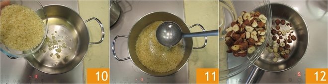 Add the rice 10 and toast until it becomes transparent, which should take around 2 minutes. Gradually add the boiling water, one ladle at a time, and cook for 10 minutes 11. In the meantime, toast the hazelnuts in another pan 12.