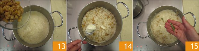 Once the 10 minutes are up, add the pears to the rice 13 and cook for another 8 minutes. Remove from the heat when done, add the stracchino, stir until creamy 14, then season with the rosemary 15.