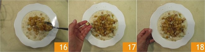 Serve the rice with the remaining pears 16, the toasted hazelnuts 17 and pepper to taste. Your risotto with pears, stracchino cheese and hazelnut is ready to be served 18.