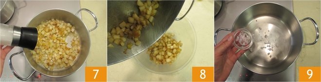 Add salt 7, cook for another 3 minutes and leave to one side 8. Brown the finely chopped shallot 9 in the same saucepan.