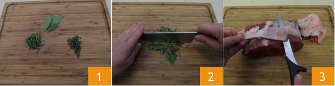 To prepare the roast beef in a salt crust, start by washing and drying the aromatic herbs 1. Proceed by finely chopping rosemary, bay leaf, and thyme 2. Then cut the excess fat from the beef 3. Depending on the chosen meat, you can tie it to give it a more compact shape or leave it as you bought it if the piece is already sufficiently compact.