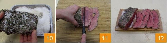 Then take the roast beef 10 and place it on a cutting board, removing the excess coarse salt if necessary. Then slice it delicately with a sharp knife or, if you prefer thinner slices, with a slicer 11: it should be pink inside. If you prefer meat not too rare, extend the cooking time by 5 minutes, depending on the weight of the meat you choose. Now your roast beef in a salt crust can be plated and enjoyed 12!