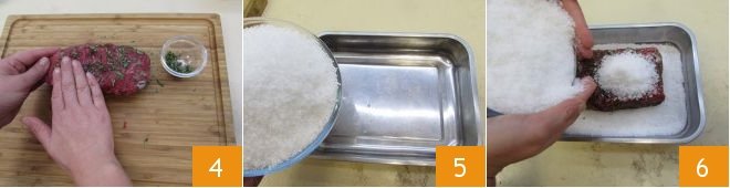 Massage the meat with the chopped aromatic herbs, rubbing them slightly on the entire surface and ensuring they adhere well on all sides 4. Now take a baking tray with high edges, and wider than the cut of meat by about 1 inch (2 cm) per side: pour a layer of salt about 1 inch (2 cm) thick on the bottom 5. Now place the roast beef on the tray and cover it evenly with salt 6, creating a layer about 1 inch (2 cm) thick on each side, a sort of shell. It is essential to use coarse salt, as fine salt would be excessively absorbed by the meat during cooking.