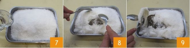 Moisten the surface of the salt crust with water 7 so that it can harden more during cooking. Finally, bake in a preheated static oven at 390°F (200°C) for 25 minutes (we do not recommend using a fan-assisted oven as it would dry the meat too much and it would not be juicy in the end). Do not open the oven until cooking is finished to prevent the temperature from dropping and ensuring optimal cooking. After the time has elapsed, remove the tray from the oven and let it rest for 10 minutes at room temperature. Then, using spoons or a knife if the crust has become very hard, gently scrape off the coarse salt 8. Gradually remove all the covering salt 9.