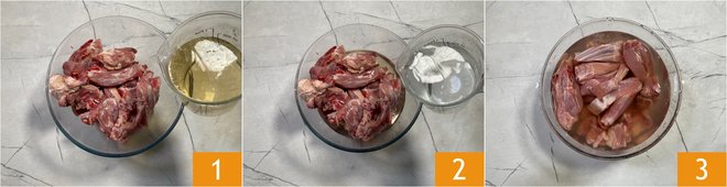 To prepare the roasted lamb with potatoes, first place the lamb pieces in a bowl and pour in the vinegar 1 and water 2. Mix and let soak while you continue with the rest of the recipe 3.