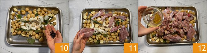 Add the juniper berries 10 and, finally, the drained lamb pieces 11. Season with salt, pepper and oil 12.