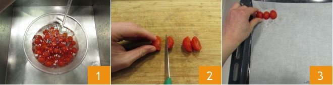 To prepare the roasted tomato and mozzarella soup, start by washing the cherry tomatoes 1. Dry them and cut them in half lengthwise 2. Then place them face down on a baking sheet lined with parchment paper 3.