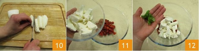 Meanwhile, move on to the mozzarella, take 7 oz from the total and cut it into large pieces 10. Collect everything in a small bowl, including any liquid that oozes out, and then pour it all into the bowl with the tomatoes 11. Add some basil leaves 12