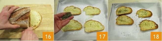 Set the soup aside and move on to making the croutons. Thinly slice the bread 16. Add a drizzle of oil along with a pinch of salt, pepper, and oregano 17. Bake, still in the preheated static oven at 430°F for 7-8 minutes, until the bread is golden 18.