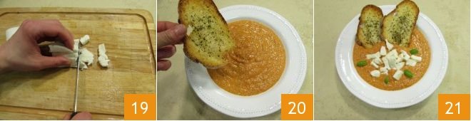 It's time to assemble the dish. Cut the remaining 3.5 oz of mozzarella into small cubes, which will be used for decoration 19. Then, pour some soup into the serving bowls and immerse the toasted bread 20. Garnish with the mozzarella cubes, basil leaves, a pinch of paprika, and a drizzle of oil. The roasted tomato and mozzarella soup is ready 21.
