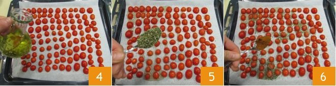 Sprinkle with about 1.5 oz of oil 4, season with salt and pepper, then flavor with dried oregano 5 and paprika 6.