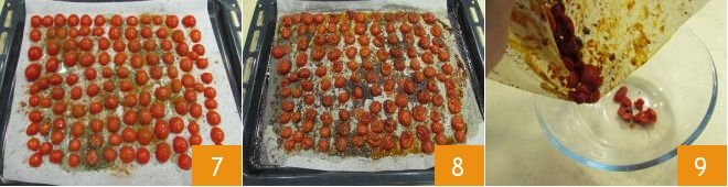 Your tomatoes are ready to cook 7. Place them on the middle-high rack in the preheated oven at 430°F, in static mode for 40-45 minutes. By the end of the cooking time, they will be roasted and juicy 8. Gather the parchment paper and transfer the tomatoes to a bowl 9 and let them cool slightly.