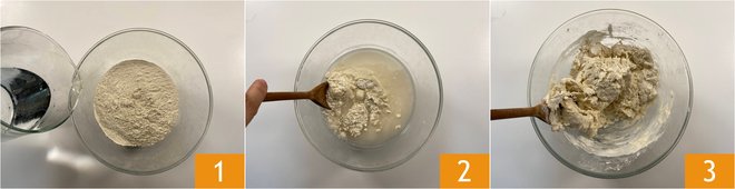 To make Roman white pizza, the water should be very cold: we recommend placing it in the fridge beforehand. Pour the flour into a bowl, add about 2 2/3 cups (650ml) of cold water 1 and start mixing slowly with a wooden spoon to hydrate all the flour. You will get a very coarse dough 3.