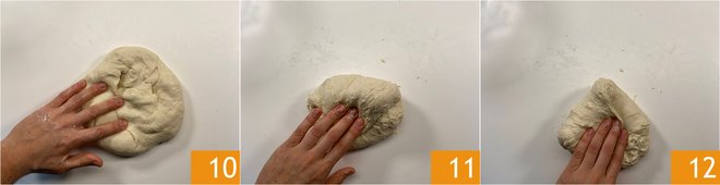 After absorbing the water 10, the dough will be rather sticky and difficult to work with, but do not add more flour. Instead, perform some 'slap&fold' folds: take the dough with both hands, lift it and slap it onto the workbench, turn it and repeat the operations 3-4 times 11 12.