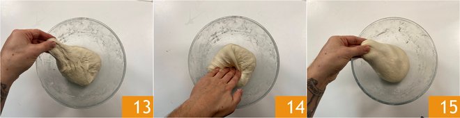 Once you have a smooth ball, you can put it back in the bowl and let it rest for 10 minutes, covered with a cloth. At this point, you can start the bowl folds: slightly moisten your hands, then take an edge of the dough 13 and bring it to the center 14, repeating the operation 4 times around the perimeter of the dough 15.