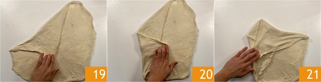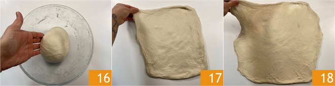 You should obtain a ball tucked into itself; flip it so the seam is always at the bottom 16. Repeat this same operation 3 times, 5-10 minutes apart between each folding round: in the end, you should have a well-strengthened dough. Finally, perform the lamination of the dough: slightly moisten your hands and the workbench, turn the dough onto the bench again, and spread it as much as possible until you get a very thin rectangle 17, you should be able to see through the dough 18.