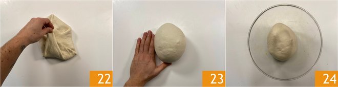 When you have brought all the edges to the center 22, flip the dough so the seam is in contact with the workbench and proceed with the pirlatura to seal the seam well 23. Let it rise in the bowl at room temperature for one hour 24, covered with plastic wrap. After this time, place it in the fridge for 24 hours.