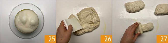After 24 hours, take the dough out of the fridge 25, turn it onto the workbench and cut out 6 pieces of about 9.9 oz (280g) each 26. Shape each piece into a rectangle 27.
