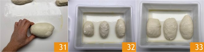 Always place the seam in contact with the workbench 31, make rotating movements bringing the dough towards you on the bench to seal it even better. Let the dough balls rest for 90 minutes in a well-oiled container, also oiled on the surface with the seam facing down. They should double in volume 33.