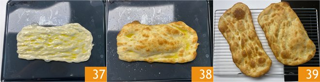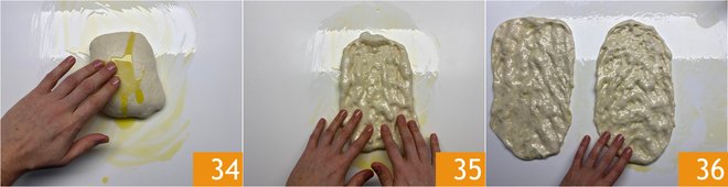 In the meantime, preheat the oven to the maximum power with a pan positioned upside down, so its base heats up perfectly. Now for the baking: spread each dough ball with plenty of oil on the workbench and surface 34. Spread by gently pulling the edges and pressing the dough with your index, middle, and ring finger along its length: you should create strips of dough 35. Sprinkle with salt flakes 36.