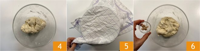 This first dough of only water and flour 4 can rest for 30 minutes covered with a cloth 5. Through autolysis, without the need for kneading, the gluten network will start to form. After 30 minutes, add the crumbled fresh yeast 6.