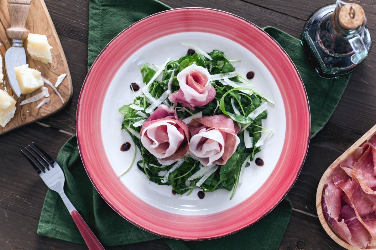 Rosa Emiliana is an appetizer built entirely around three of Emilia-Romagna's most protected products: Prosciutto di Parma, Parmigiano Reggiano DOP, and Aceto Balsamico di Modena. Each one carries a designation of origin that reflects years — in some cases decades — of production. The dish brings them together in a single plate, dressed with olive oil and balsamic, and shaped into something that earns its name: slices of prosciutto rolled into 24 small roses, arranged over a bed of arugula and Parmigiano shavings like a bouquet.