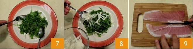 Plate the arugula by placing it in the center of a serving dish 7 and garnish it with the Parmigiano shavings 8. Now cut the slices of Parma ham in half lengthwise 9.