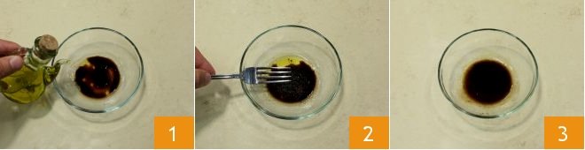 To make the Emilian Rose, start with the dressing. Prepare an emulsion by placing the balsamic vinegar, olive oil 1, and salt in a bowl.