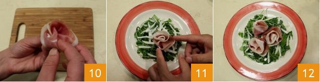 and create a small rose from each half: holding one end of the ham, you can roll it onto itself, folding the edges to make them resemble rose petals 10. Continue until you have 24. Gently place the small roses on the seasoned arugula 11, positioning them in the center to form a bouquet 12.