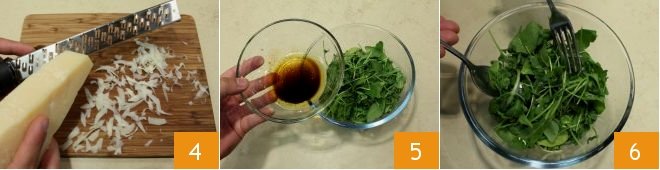 Grate the Parmigiano into shavings and set it aside 4. After washing and drying the arugula, season it in a large bowl by pouring the emulsion over it 5 and mixing it well to flavor all the leaves 6.