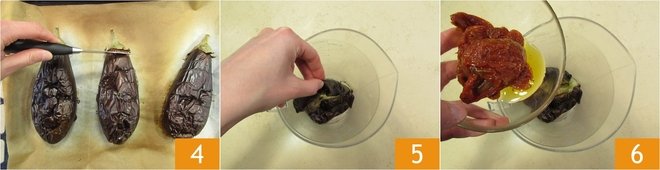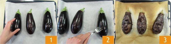 To prepare rustic eggplant pesto, start by cooking the eggplant: place it on a tray with parchment paper 1 and pierce it with a fork all over its surface 2 to help it cook. Bake in a static oven preheated to 482° for 45 minutes. Remove from the oven when done 3.