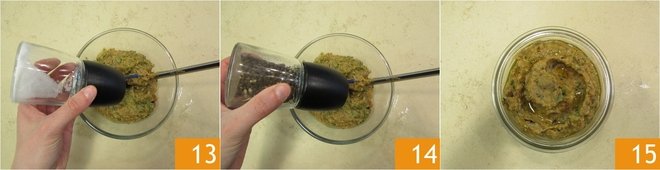 Lastly, add salt 13 and pepper 14 to taste and stir with a spoon. Your rustic eggplant pesto is ready 15!