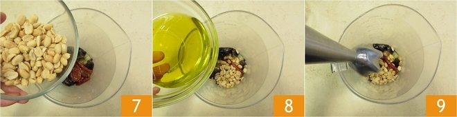 Add the peanuts 7, the oil 8 and blend for a few seconds with an immersion mixer 9.