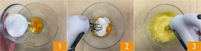 To prepare saffron tiramisù, first separate the egg yolks from the whites into 2 bowls. Add the yolks and sugar 1 and beat with an electric mixer 2 until a light and creamy mixture is obtained 3.