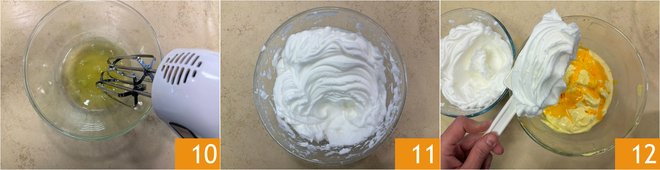 Beat the egg whites with the mixer 10 until stiff peaks form 11. Gradually incorporate the egg whites into the cream with a spatula: start by vigorously mixing the mixture with a portion of the egg whites 12.