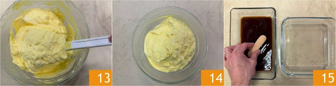 Then continue to incorporate the rest gradually, taking care to mix gently from bottom to top to avoid deflating the mixture. Once the cream is obtained 14, dip the ladyfingers in the espresso coffee (sweetened to taste) 15.