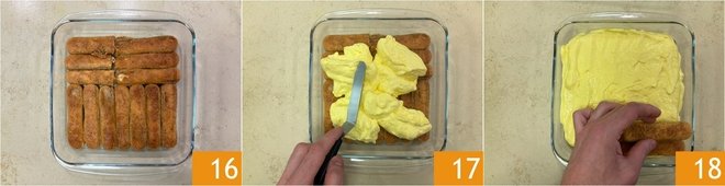 Place them at the base of a 8x8 inch pan 16, add a few tablespoons of cream spreading it over the entire surface 17, then continue with a second layer of ladyfingers 18.