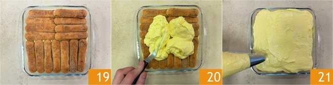 The ladyfingers should cover all the cream 19. Finish with another layer of cream and smooth it well with a spatula 20. Now transfer the remaining mascarpone cream into a pastry bag with a 1/2 inch star tip and pipe dollops on the surface 21.