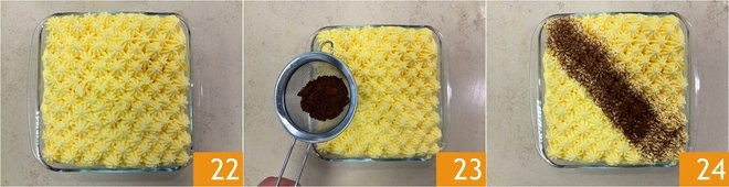 Once the surface is decorated 22, dust with cocoa powder as desired 23. Let the saffron tiramisù rest in the refrigerator for 2-3 hours before serving 24.