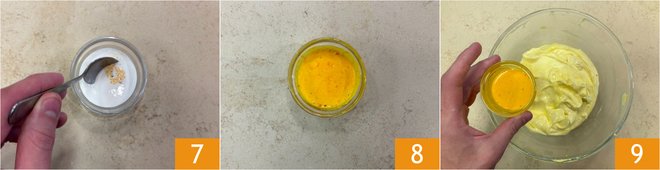 Mix 7 until the mixture is a beautiful golden color 8. Add the saffron dissolved in the cream to the previously whipped mixture 9 and set aside.