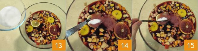 Now, pour the apple and peach cubes into a large bowl, and then add the juice from the citrus fruits 10 and cut up oranges and lemons 11. Add the red wine 12