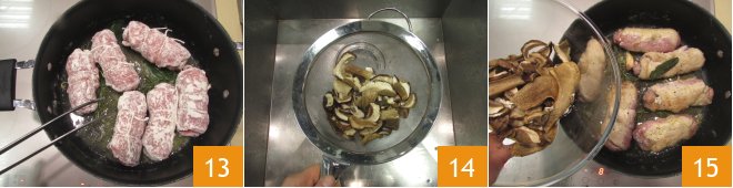 Place the rolls in the pan and brown them 13, turning often, over medium heat until the meat is well sealed on all sides. Season with salt and pepper to taste, then drain the mushrooms well 14 and add to the rolls 15.
