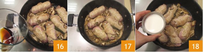 Add the Marsala wine 16, and as soon as the alcohol has evaporated (this will only take a few moments) 17, pour in the light cream 18.