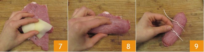 and cover with a couple of slices of provolone 7. Roll the whole thing up 8 and fasten with kitchen string 9.