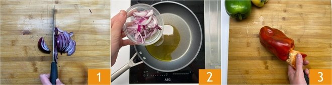 To prepare the sautéed bell peppers first slice the onion 1 and let it sweat on low heat in a pan with a drizzle of oil 2. Keep an eye on it and stir it occasionally. In the meantime, clean the bell peppers, start by removing the top 3.