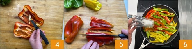 Cut them in half and remove the internal ribs and any seeds 4. Then cut the bell peppers into strips 5 and as soon as the onion is well softened, add them to the pan. Add a pinch of salt 6.