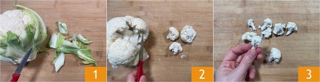 To prepare the sautéed cauliflower, start with cleaning: remove the outer leaves 1, then use a small knife to trim the base of the florets 2 and pull off the smaller pieces by hand 3.