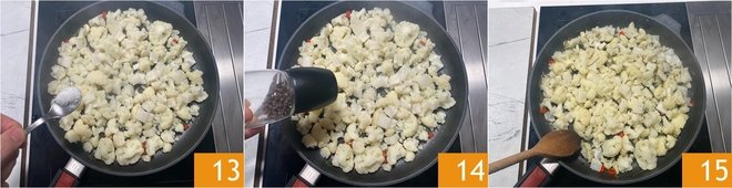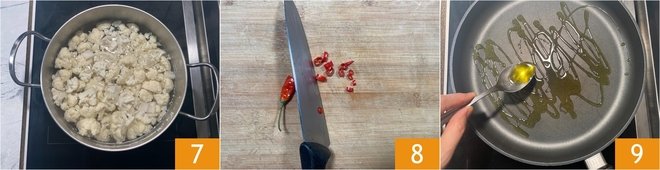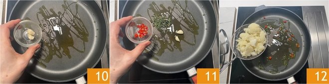 Flavor with the peeled garlic cloves 10 and the sliced chili 11. Once boiled, drain the cauliflower with a slotted spoon and transfer it to the pan with a little of its cooking water 12.